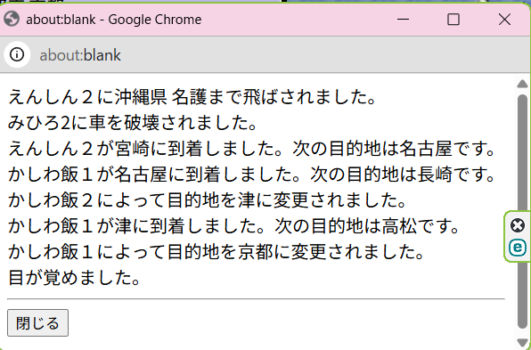 【みひろ殿】(゚ж゚)ゝ直接細かいルール説明をしてないんで今回だけは罰則なしで見逃しまつ! 再確認を!d(゚ж゚)っ[※他のご参加者様にご使用が禁止になっているアイテムは「くぎ・まきびし・交換権・睡眠薬・睡眠薬DX・爆弾・爆弾DX・ビール・ウイスキー」となります。「まきびし・睡眠薬DX・爆弾DX・ウイスキー」のアイテムに限ってはご自身の為のご使用も禁止となりますのでお気を付け下さい。 万が一これらのアイテムをご使用になってしまい他のご参加者様にダメージを与えてしまった場合は罰則がありご使用の回数により最終順位が1位ずつ下位に転落(例:最終順位1位で2回ご使用→2位転落で最終順位3位)致します。その確認は.珍走記管理人(もも殿)もしくは管理組合(彩殿・熊殿)が行いますが確実に発見出来る訳ではありませんのでご使用になってしまい他のご参加者様にダメージを与えてしまったご参加者様は包み隠さず正直に“○○殿に対しアイテムの○○を使用して○○してしまいました”とチャット(中間部)にてご報告して下さい。 ※四次元ポケットはご使用可能なアイテムになりますが出すタイミングによっては他のご参加者様の車両を破壊したり酔わせたりする場合がありご使用が禁止になっているアイテムを使ってしまったのではないか?と疑われ違反とみなされてしまいますので上記同様に必ず“四次元ポケットを使用した為攻撃したの訳でありません”とチャット(中間部)にてご報告して下さい。]
